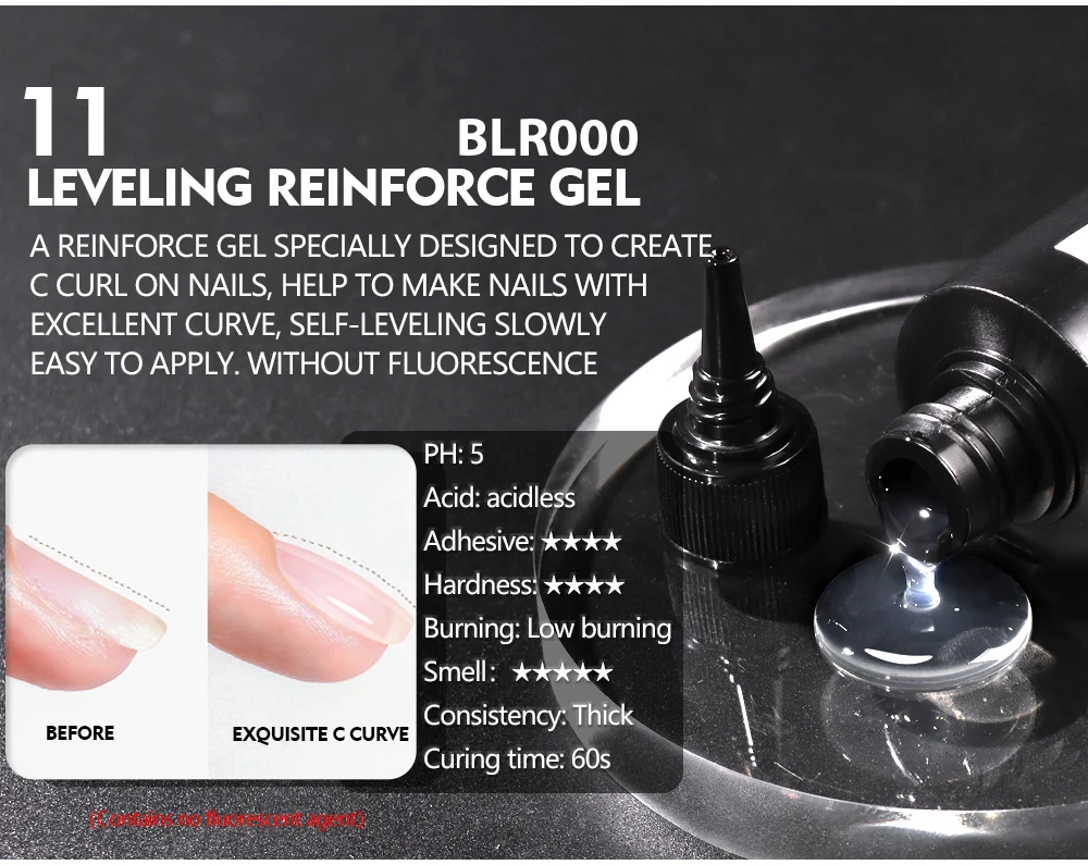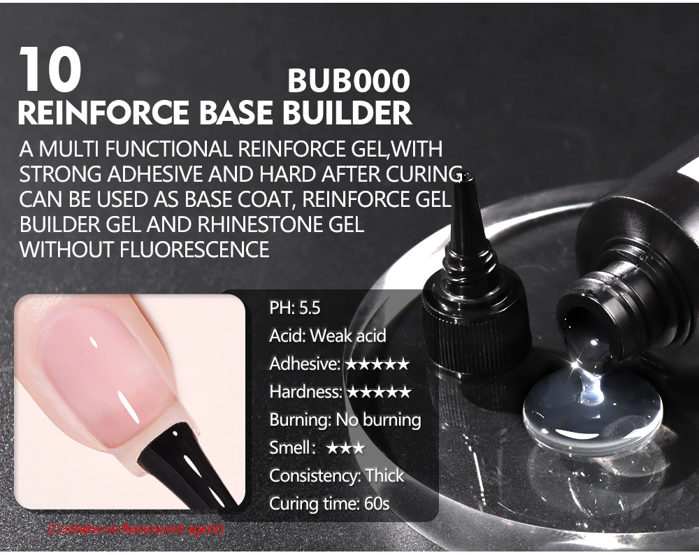 A multi functional reinforce gel, with strong adhesive and hard after curing. Can be used as base coat, reinforce gel, builder gel and rhinestone gel. Without fluorescence.