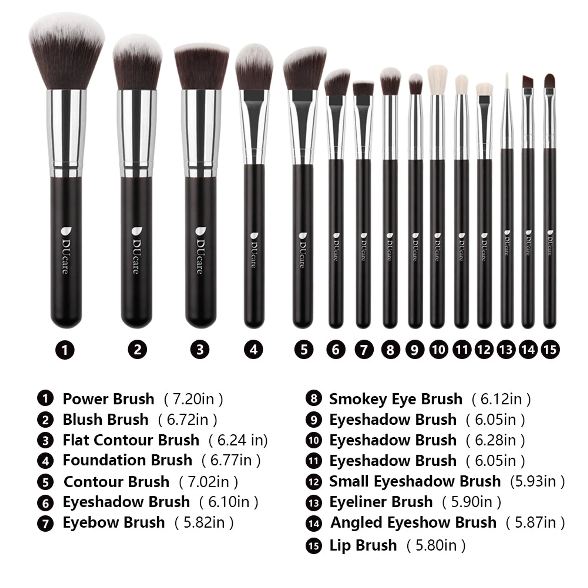 11 Flat Eyeliner Brush; 12 Eyeshadow Brush;13 Eyeshadow Brush; 14 Smudge Brush; 15 Concealer Brush;