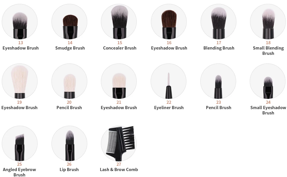 16 Blending Brush; 17 Concealer Brush; 18 Eyeshadow Brush; 19 Eyeshadow Brush; 20 Eyelner Brush;21 Eyeshodow Brush; 22 Eyeshadow Brush; 23 Blending Brush; 24 Pencil Brush; 25 Fan Brush;