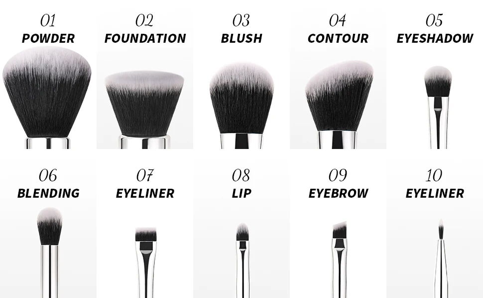 06 Large Concealer Brush; 07 Blush Brush; 08 Hightlight Brush; 09 Shader Brush; 10 Angeled Eyeshadow Brush;