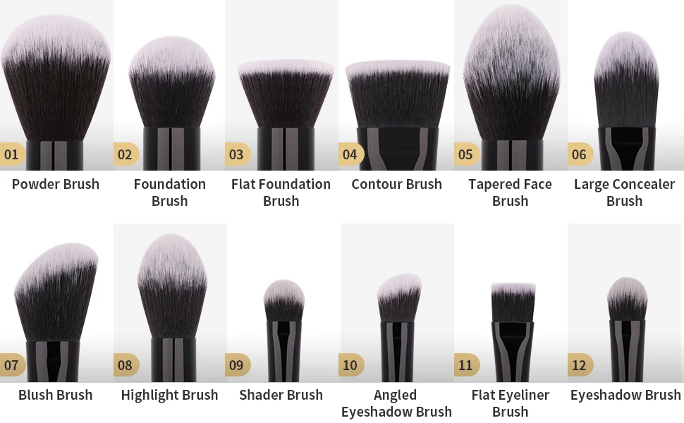 01 Powder Brush; 02 Foundation Brush; 03 Contour Brush; 04 Blending Brush; 05 Blending Brush;
